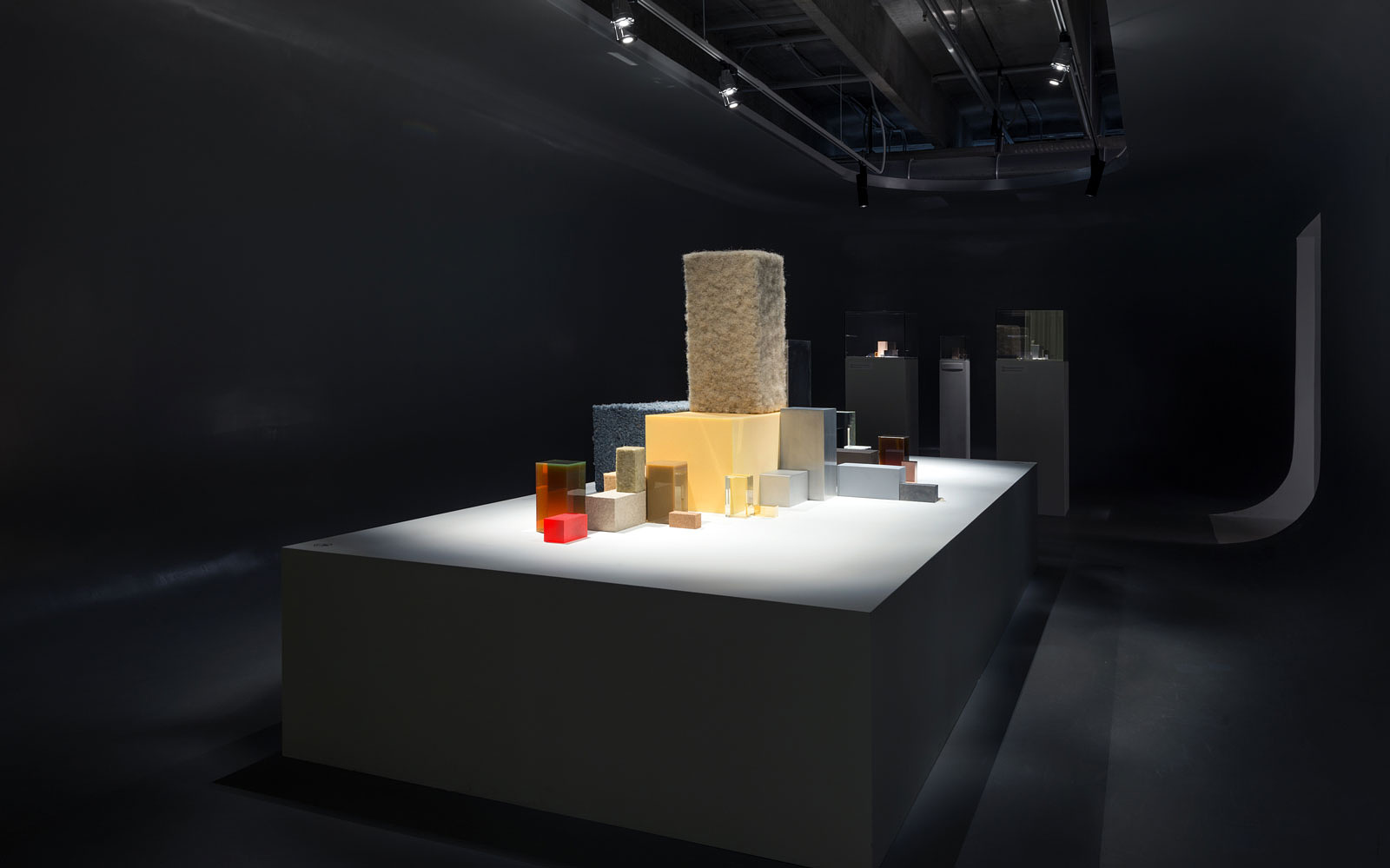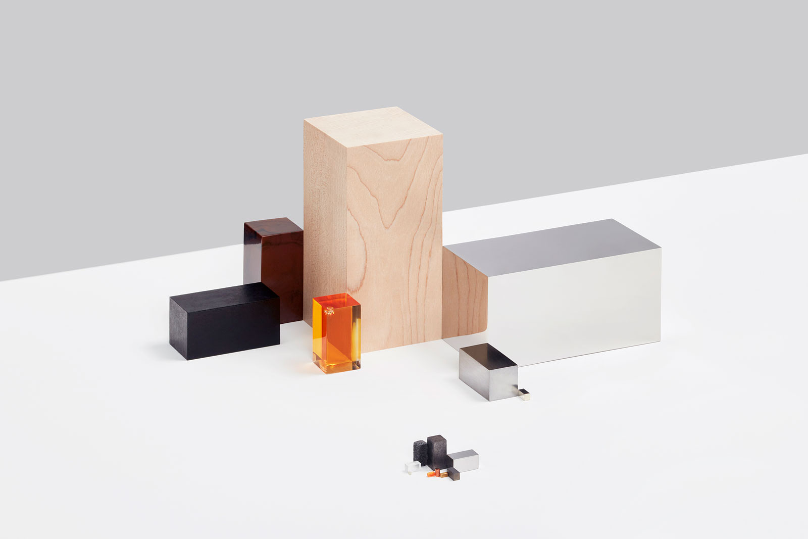 Everyday products such as a vacuum cleaner, a Volkswagen Beetle, a pencil, and PET bottles have been reduced to the exact quantity of the specific raw materials from which they are made, shown in the form of rectangular blocks.